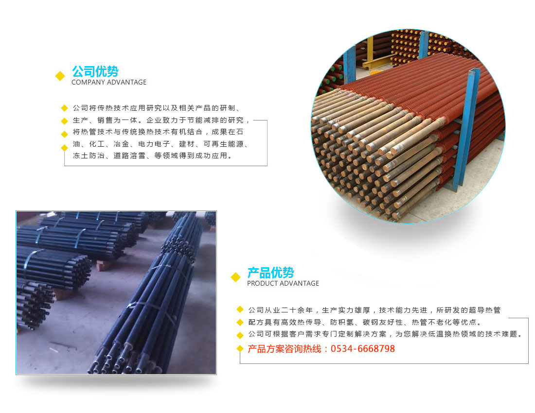 年的技術(shù)人員組建而成。公司研發(fā)的超導(dǎo)熱管配方具有高效熱傳導(dǎo)、防積氫、碳鋼友好性、熱管不老化等優(yōu)點(diǎn)。我公司可根據(jù) 客戶(hù)需求專(zhuān)門(mén)定制解決方案,為你解決低溫?fù)Q熱領(lǐng)域的技術(shù)難題。